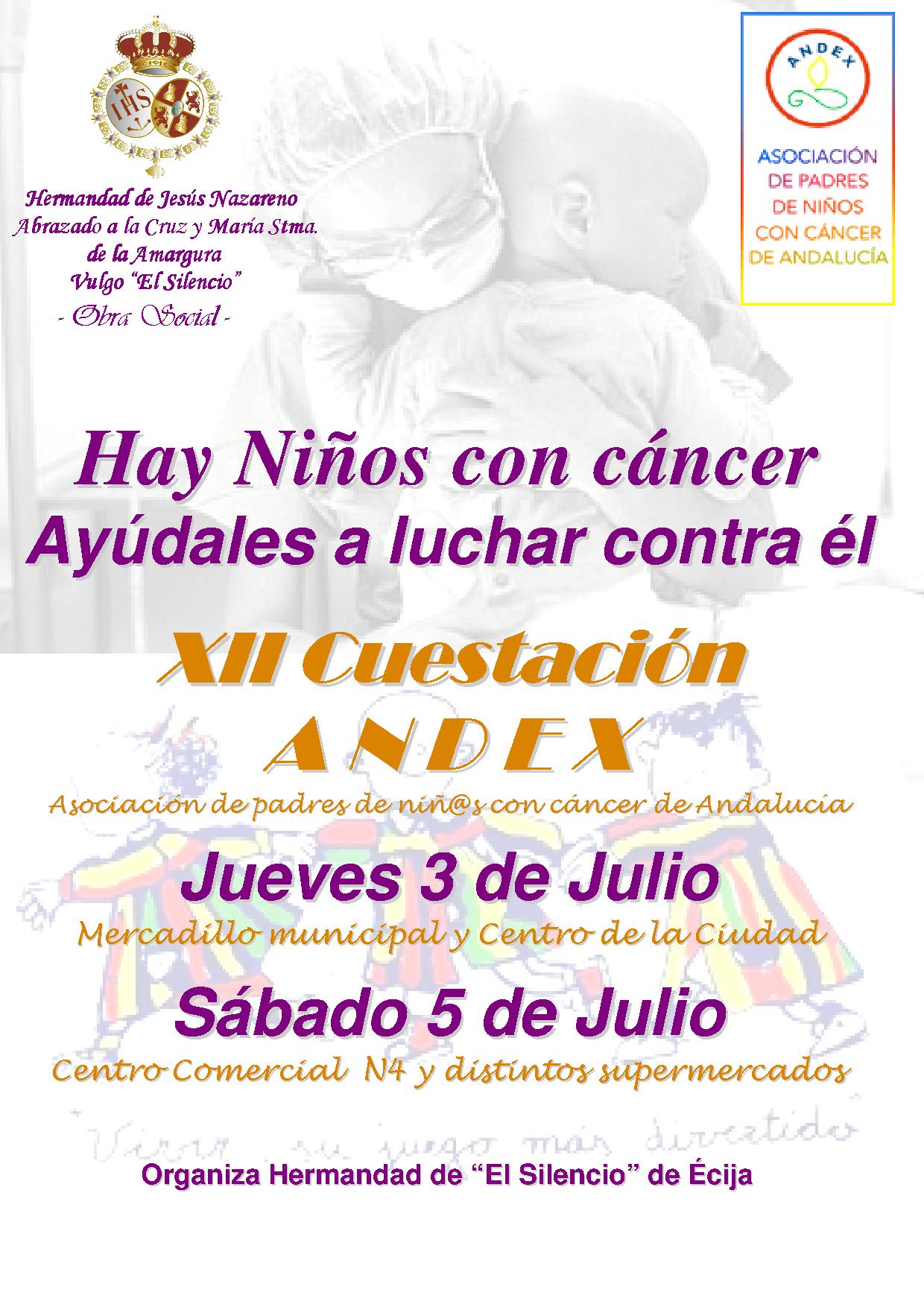 Durante los próximos días tres y cinco de Julio, nuestra Hermandad, organizará un año más la tradicional Cuestación extraordinaria a beneficio de los niños con cáncer, pertenecientes a la Asociación ANDEX.