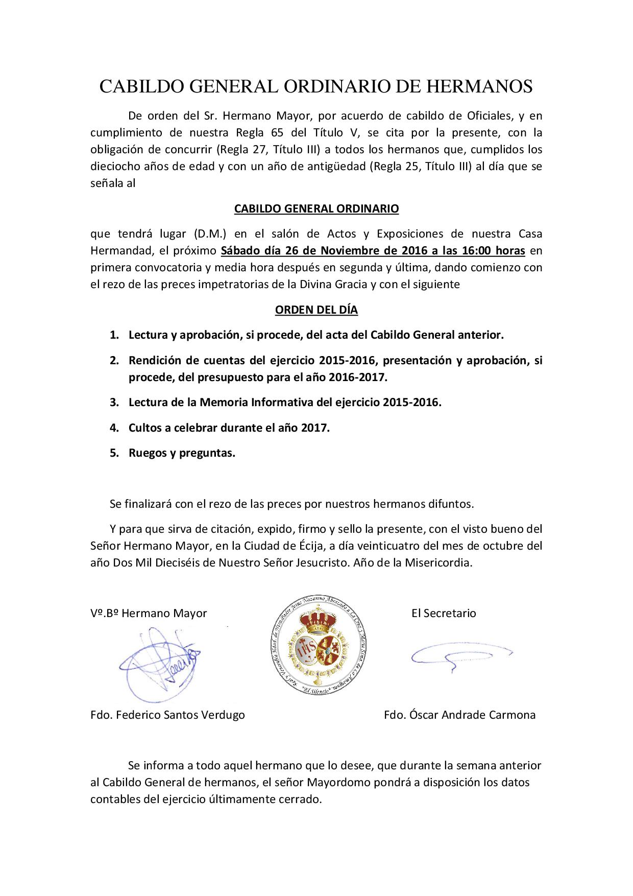 Por orden del Sr. Hno. Mayor, y acuerdo de Cabildo de oficiales, y en cumplimiento de nuestras Reglas, se cita a todos los hermanos mayores de edad y con un año de antigüedad, a concurrir a Cabildo General Ordinario.