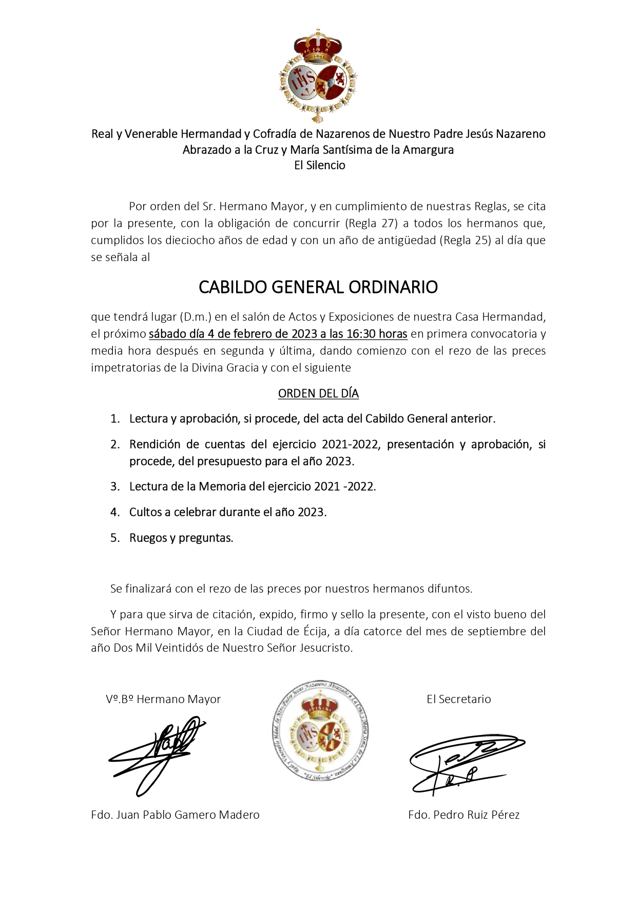 Recordamos a nuestros hermanos, cumplidos los dieciocho años de edad y con un año de antigüedad al día que se señala, de la citación del Cabildo General Ordinario, que se celebrará en nuestra Casa Hermandad el próximo sábado 4 de febrero a las 16:30 horas, en primera convocatoria, y media hora después, en segunda y última, conforme al orden del día señalado.