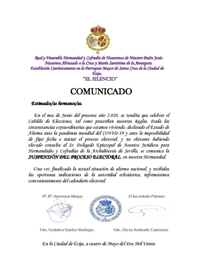 Se comunica a los hermanos que tras haber realizado la consulta oportuna al Sr. Delegado Episcopal de A.A.J.J. para Hermandades y Cofradías de nuestra Archidiócesis, ante la situación de estado de alarma provocada por la pandemia del COVID-19, el proceso electoral previsto para el próximo mes de junio queda aplazado una vez finalizada tal situación y a la espera de las indicaciones oportunas de la autoridad eclesiástica.