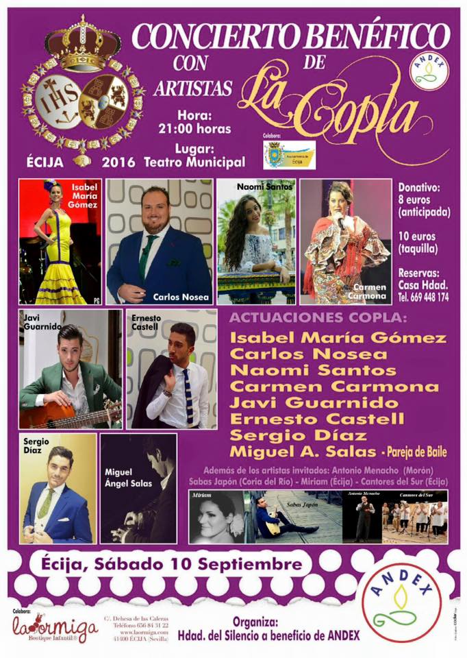 El próximo sábado 10 de septiembre a las 21:00 horas tendrá lugar, en el Teatro Municipal de Écija, concierto en beneficio de ANDEX (Asociación de Padres de Niños con Cáncer de Andalucía), donde participarán entre otros, artistas del programa televisivo "Se llama copla".