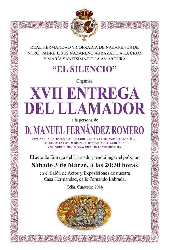 El próximo sábado 3 de marzo a las 20:30 horas en el Salón de Actos y Exposiciones de nuestra Casa Hermandad tendrá lugar la XVII Entrega del Llamador, que recaerá en esta edición en la persona de D. Manuel Fernández Romero, capataz de Nuestra Señora de los Dolores de la Hermandad de la Expiración.