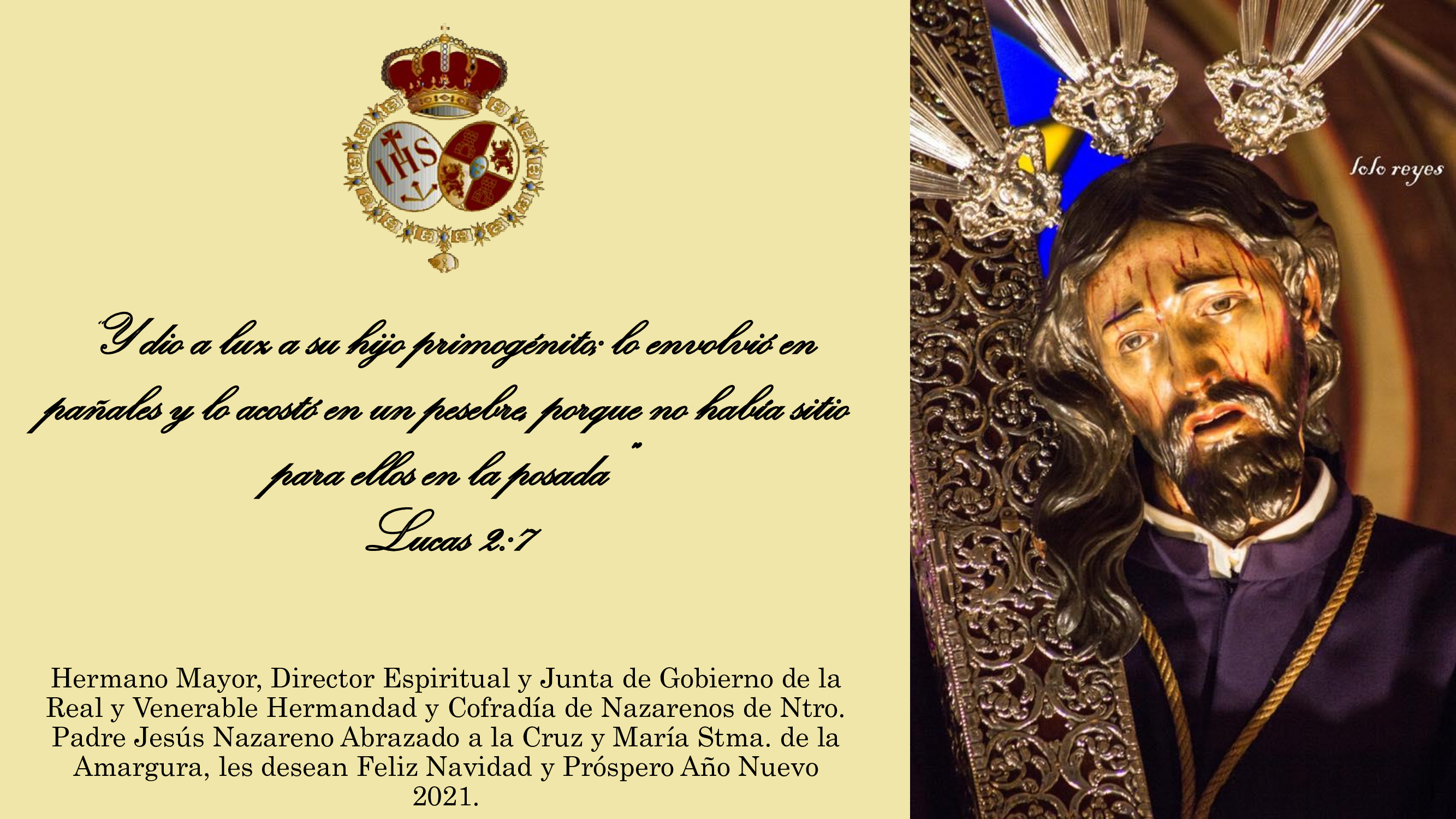 El Hermano Mayor, Director Espiritual y Junta de Gobierno de la Hermandad de "EL SILENCIO", os desean Feliz Navidad y Próspero año 2021.