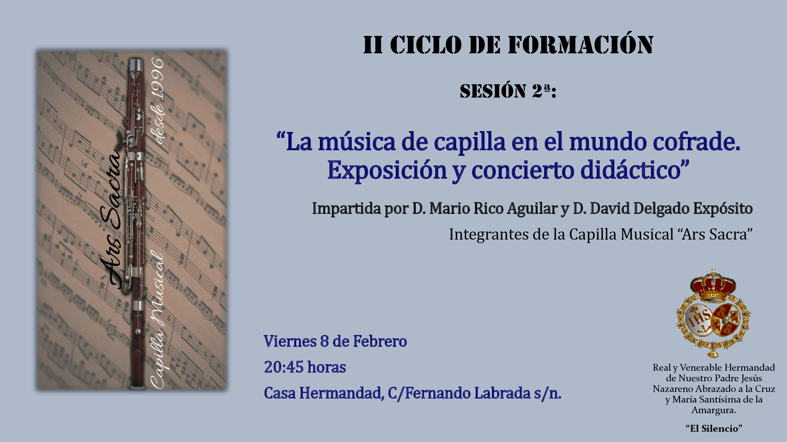 Este Viernes 8 de febrero a las 20:45 horas, en el salón de actos de nuestra Casa Hermandad, sita en calle Fernando Labrada s/n, tendrá lugar (D.m.), la segunda sesión del II Ciclo de Formación para el presente curso cofrade 2018/2019, bajo el título "La música de capilla en el mundo cofrade. Exposición y concierto didáctico".