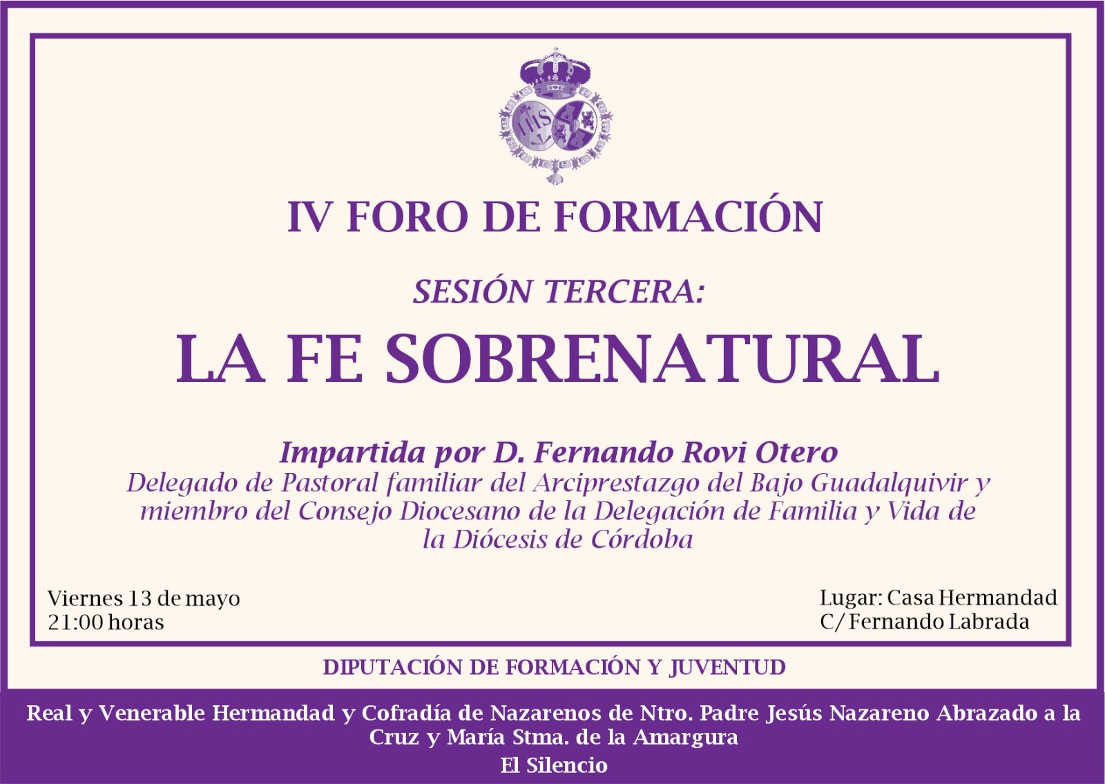 Este viernes, 13 de mayo, a las 21:00 horas, tendrá lugar en nuestra Casa Hermandad, la tercera sesión del IV Foro de Formación que organiza nuestra Hermandad, sobre “La Fe Sobrenatural”.