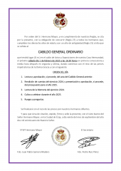 Recordamos a nuestros hermanos, mayores de edad y con un año de antigüedad al día que se señala, de la citación a Cabildo General Ordinario de hermanos, a celebrar el próximo sábado 1 de febrero, en el salón de actos de nuestra casa de hermandad, a las 16:30 horas en primera convocatoria y media hora después en segunda y última, conforme al orden del día fijado.