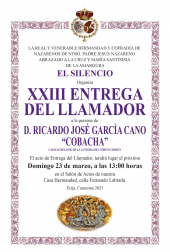 El próximo domingo, 23 de marzo, a las 13:00 horas, tendrá lugar la vigésimo tercera entrega del llamador a D. Ricardo José García Cano "Cobacha", capataz del paso de la custodia del Corpus Christi.