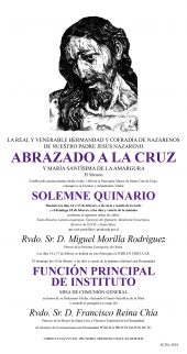 Durante el domingo 10 de marzo, IV de Cuaresma, de 10:00 a 20:00 horas, se encontrará nuestro Amantísimo Titular, en solemne y devoto besapiés, concluyendo con el piadoso ejercicio de las cinco llagas.