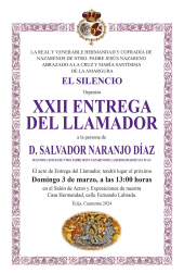 El próximo domingo, 3 de marzo, a las 13:00 horas, se celebrará en el salón de actos de nuestra Casa de Hermandad, la vigésimo segunda entrega del llamador a D. Salvador Naranjo Diaz, segundo capataz del paso de Ntro. Padre Jesús Nazareno, de la Hermandad de San Juan.