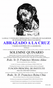 Esta Hermandad celebrará (D.m.), Solemne Quinario en honor a su Dulcísimo Titular, dando comienzo el próximo miércoles 2 de marzo, Miércoles de Ceniza, hasta el sábado 5 a las 19:30 horas y el domingo 6 a las 10:30 horas.
