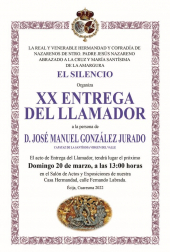 El próximo domingo 20 de marzo, a las 13:00 horas, se llevará a cabo en el salón de actos de nuestra Casa Hermandad, la XX Entrega del Llamador a N.H.D. José Manuel González Jurado, capataz del paso de la Stma. Virgen del Valle.