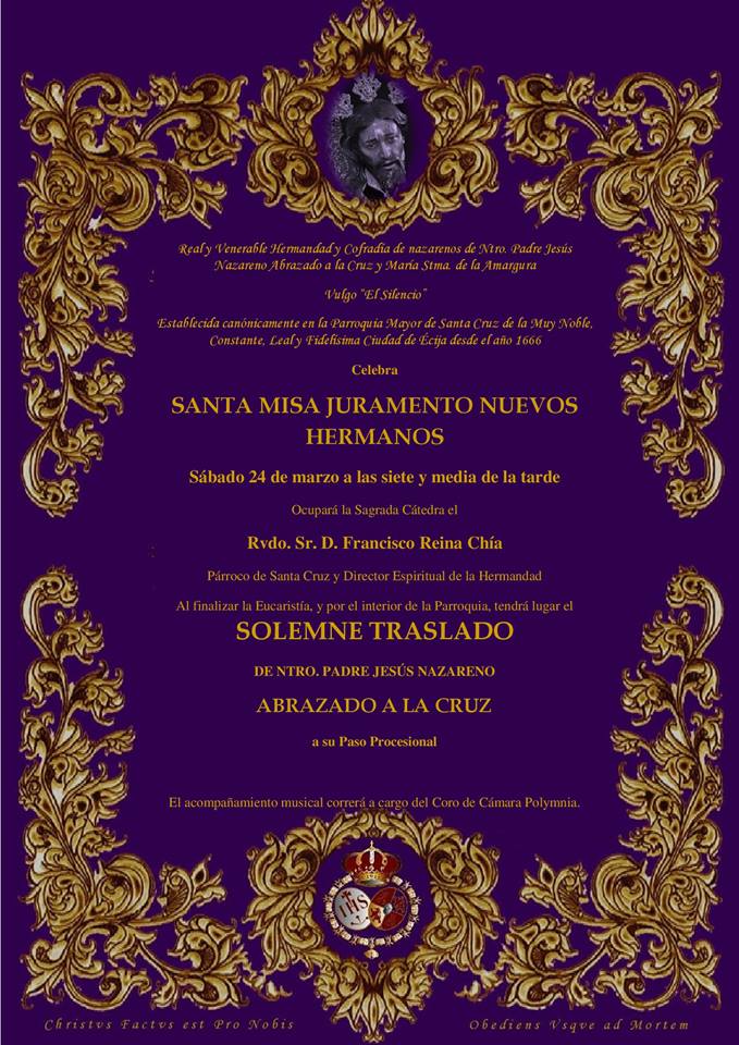 Este sábado, 24 de marzo a las 19:30 horas tendrá lugar (D.m.) la Santa Misa de Juramento de nuevos hermanos. Previamente y a las 18:15 horas se mantendrá la reunión preparatoria para los mismos.