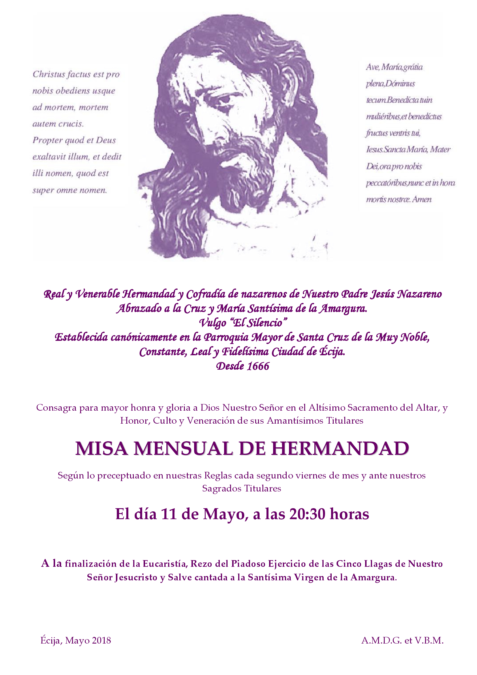 El próximo viernes 11 de mayo, como cada segundo viernes de mes se celebrará (D.m.) Santa Misa mensual de Hermandad a las 20:30 horas ante el altar de nuestros Sacratísimos Titulares.