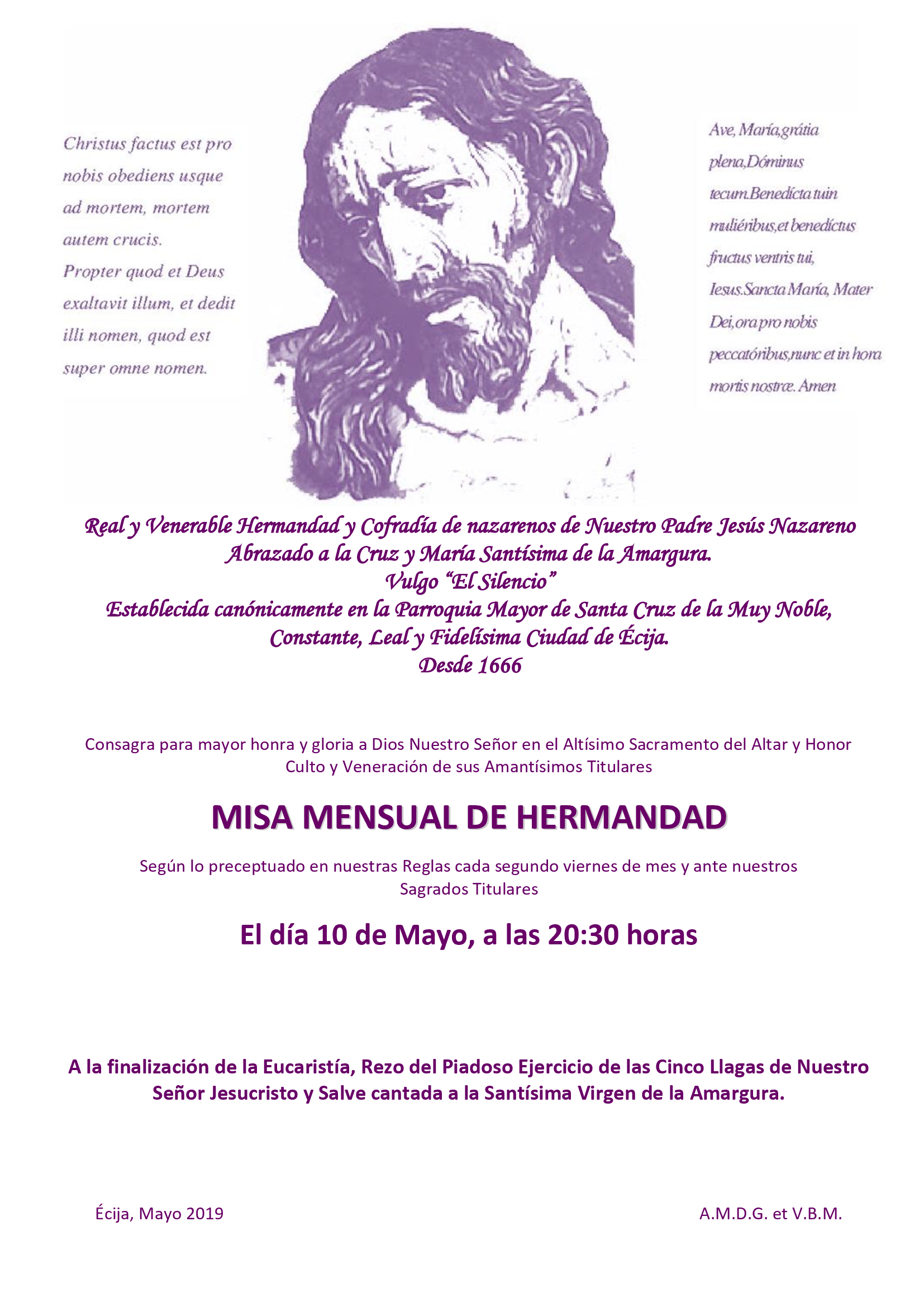 El próximo viernes 10 de Mayo, como cada segundo viernes de mes se celebrará (D.m.) Santa Misa mensual de Hermandad a las 20:30 horas ante el altar de nuestros Sacratísimos Titulares.