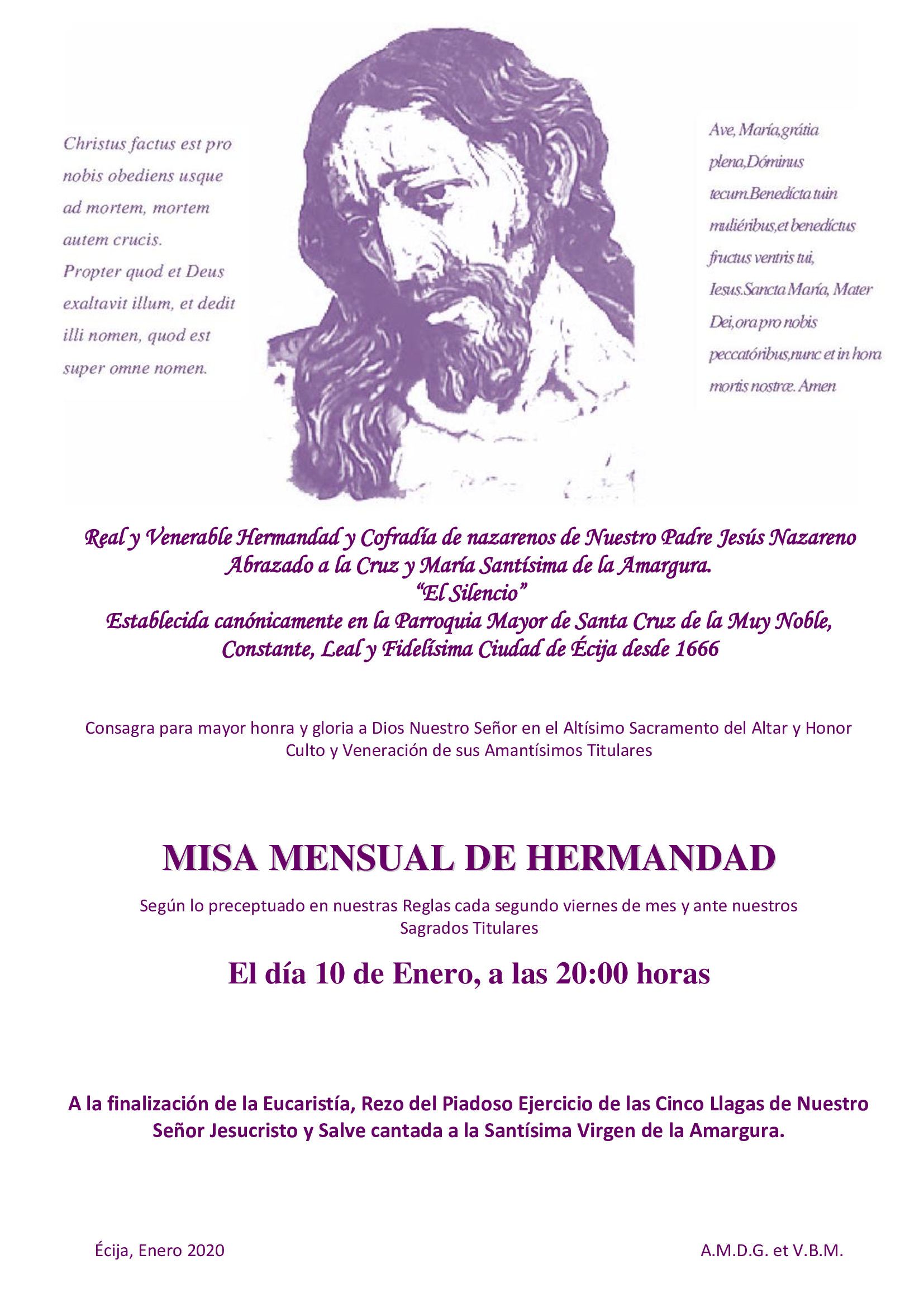 Este viernes 10 de enero a las 20:00 horas y ante el altar de nuestros Sagrados Titulares, tendrá lugar (D.m.) Santa Misa mensual de Hermandad.