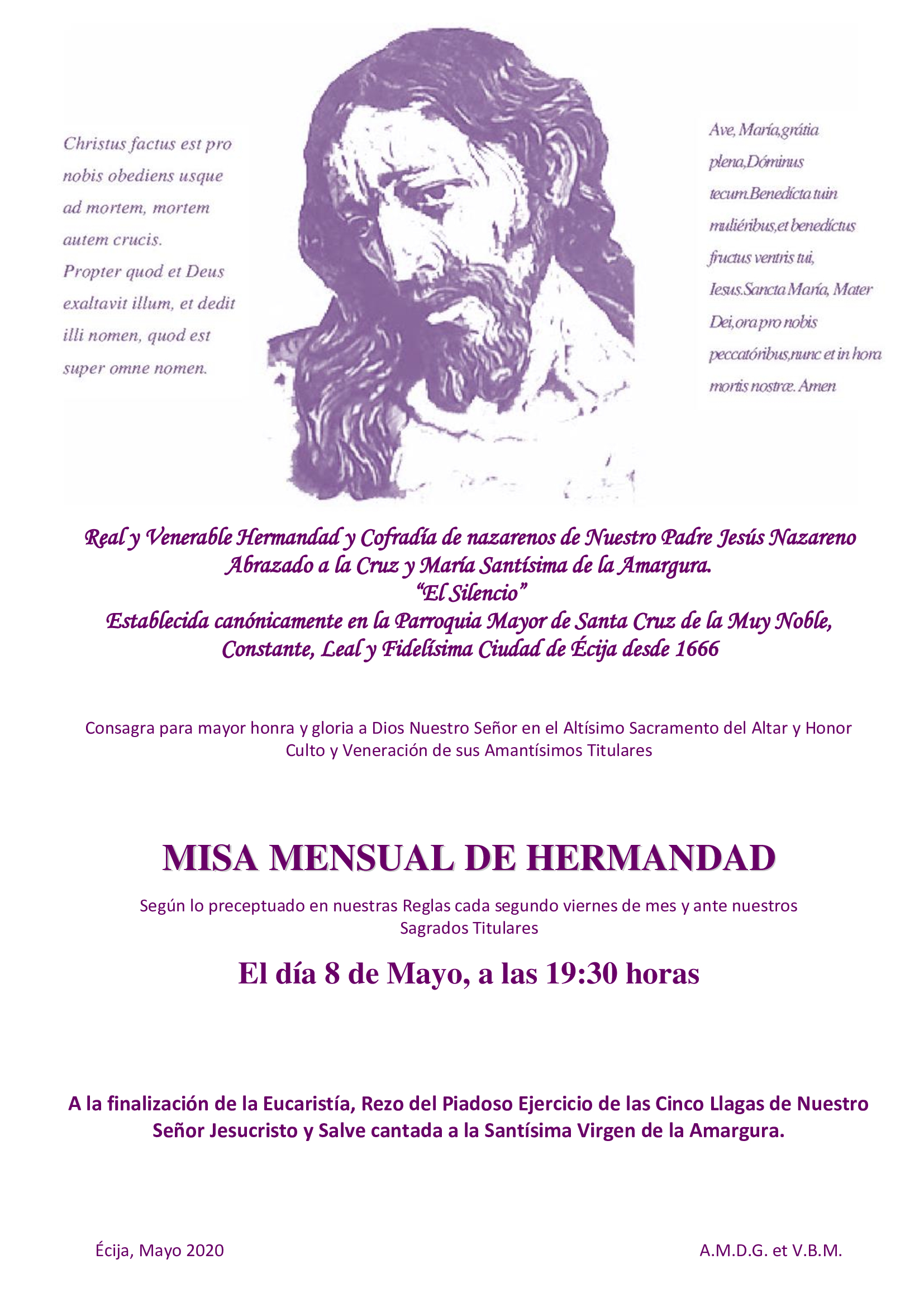 Este viernes 8 de Mayo, como cada segundo viernes de mes se celebrará (D.m.) Santa Misa mensual de Hermandad a las 19:30 horas ante el altar de nuestros Sacratísimos Titulares.