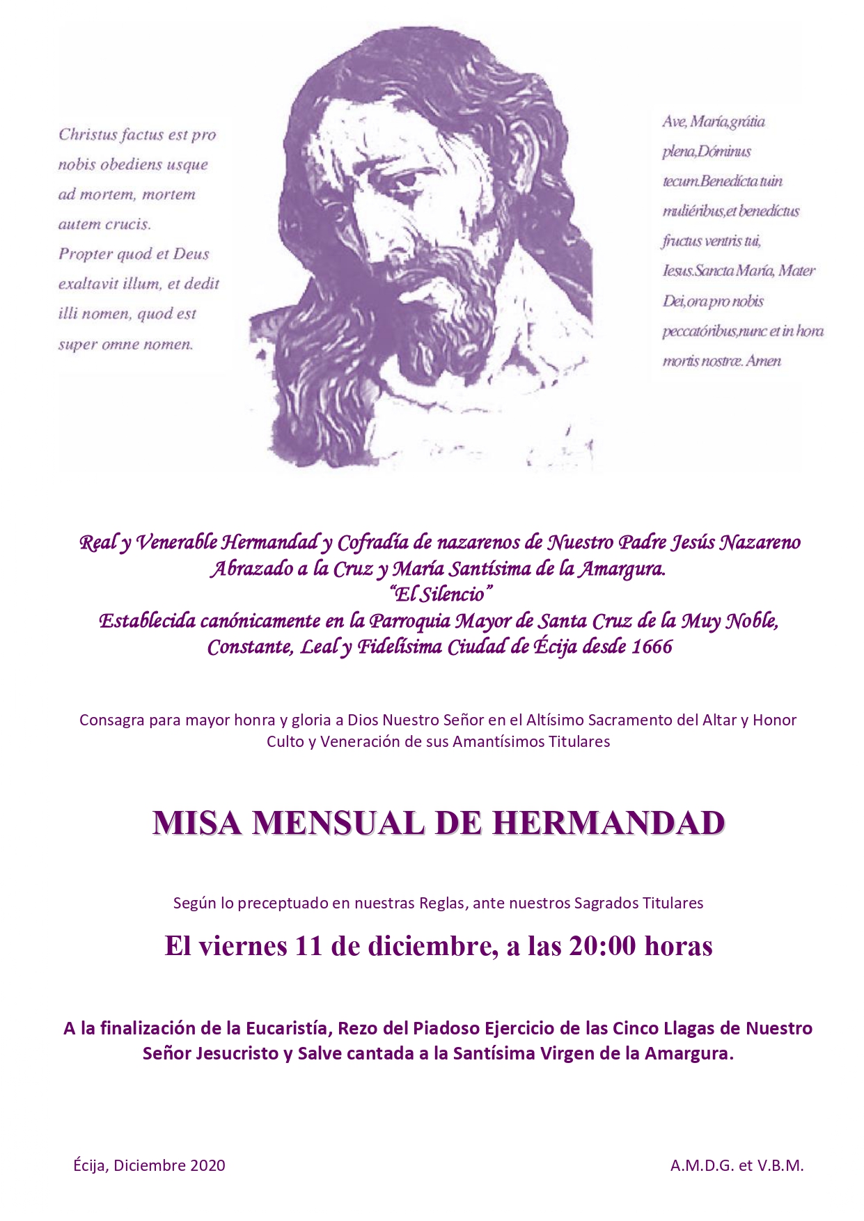 El próximo viernes 11 de diciembre, se celebrará (D.m.), tal y como prescriben nuestras Reglas, misa mensual de Hermandad a las 20:00 horas, ante al altar de nuestros Sacratísimos Titulares.