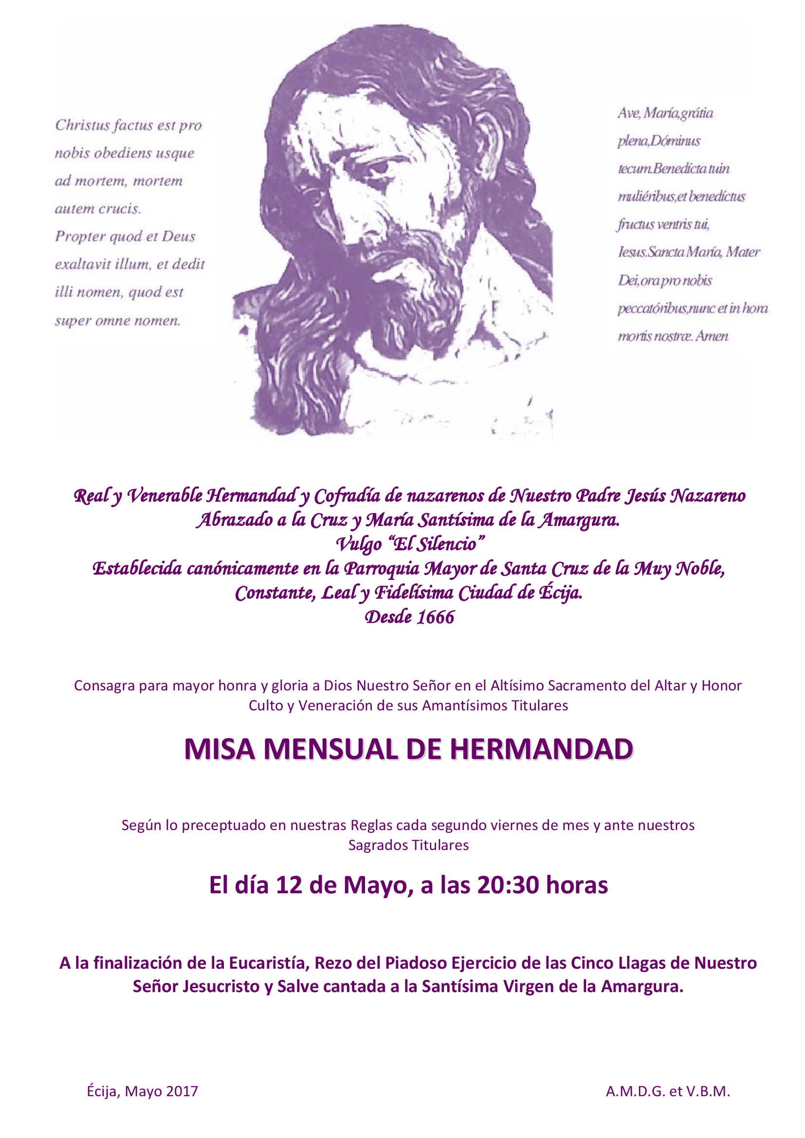 El próximo viernes, 12 de mayo, tendrá lugar (D.m.) Misa mensual de Hermandad, a las 20:30 horas, ante el altar de nuestros Sagrados Titulares.