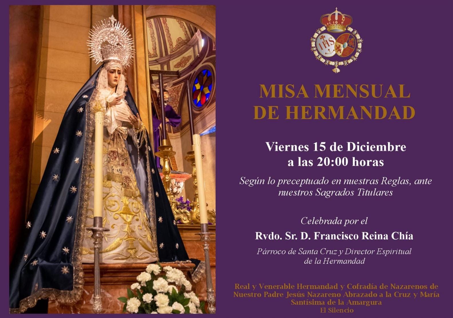 Este viernes, 15 de diciembre, se celebrará (D.m.) misa mensual de Hermandad a las 20:00 horas, ante el altar de nuestros Sacratísimos Titulares.