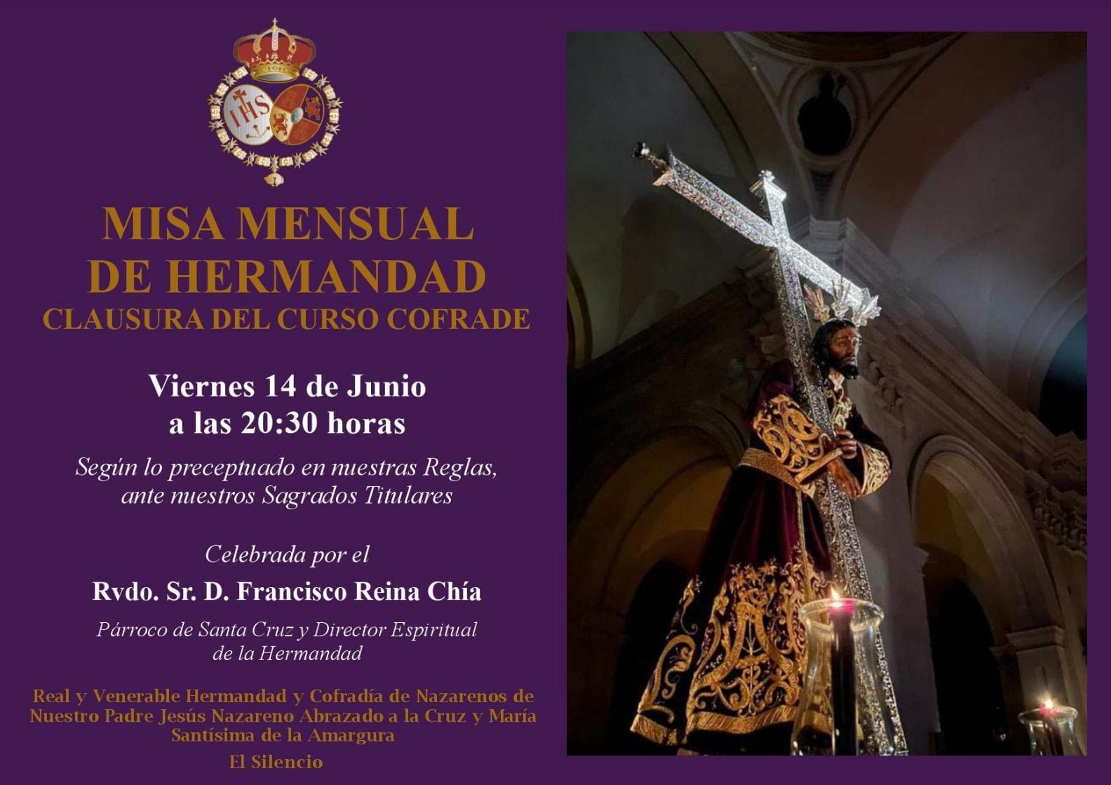 Este viernes, 14 de junio, se celebrará a las 20:30 horas (D.m.), misa mensual de Hermandad, en la que se clausurará el presente curso cofrade.