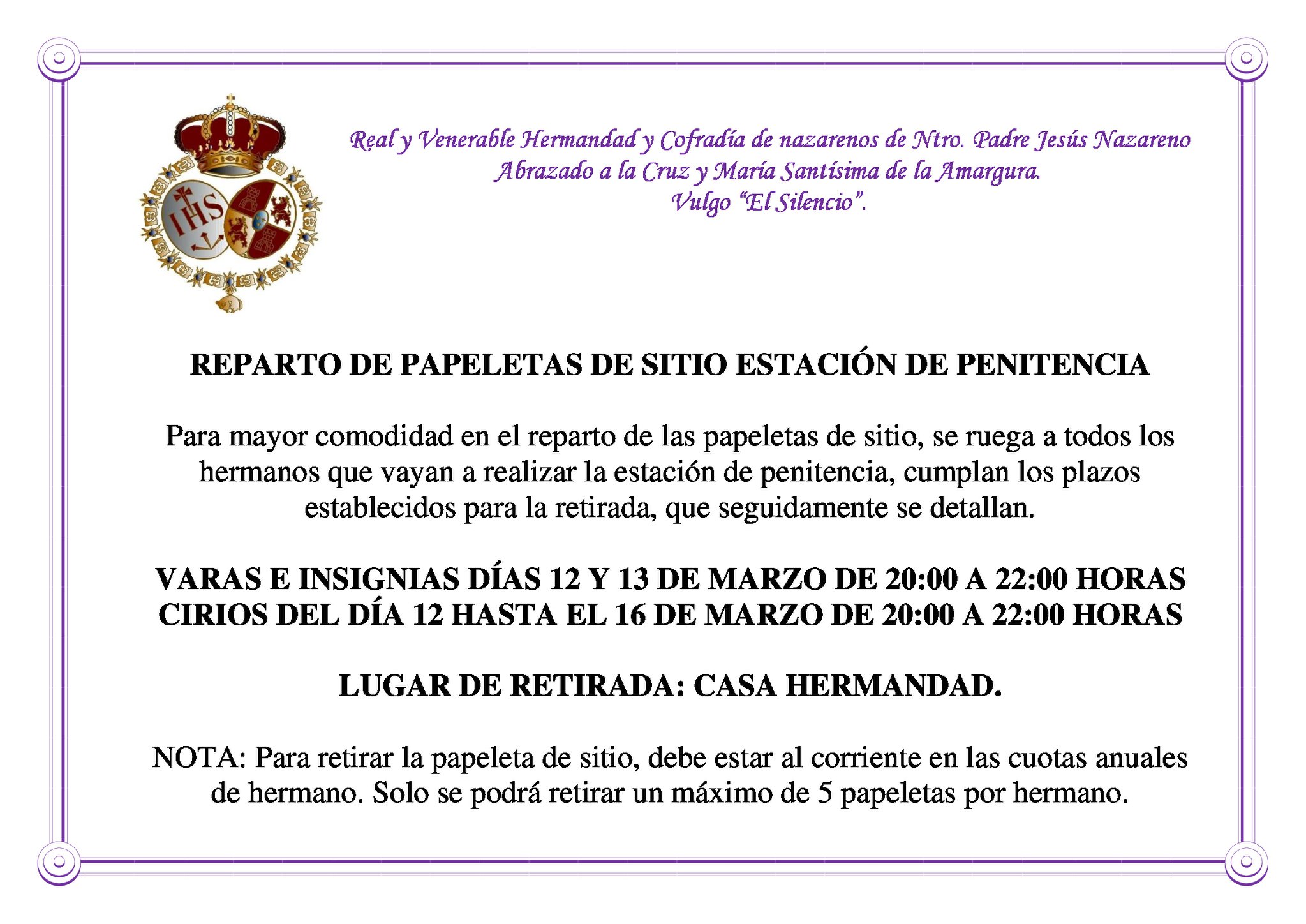Será requisito indispensable para la retirada de papeletas de sitio estar al corriente de las cuotas de hermano. Se informa también que solo se pondrán expedir cinco papeletas por persona.
