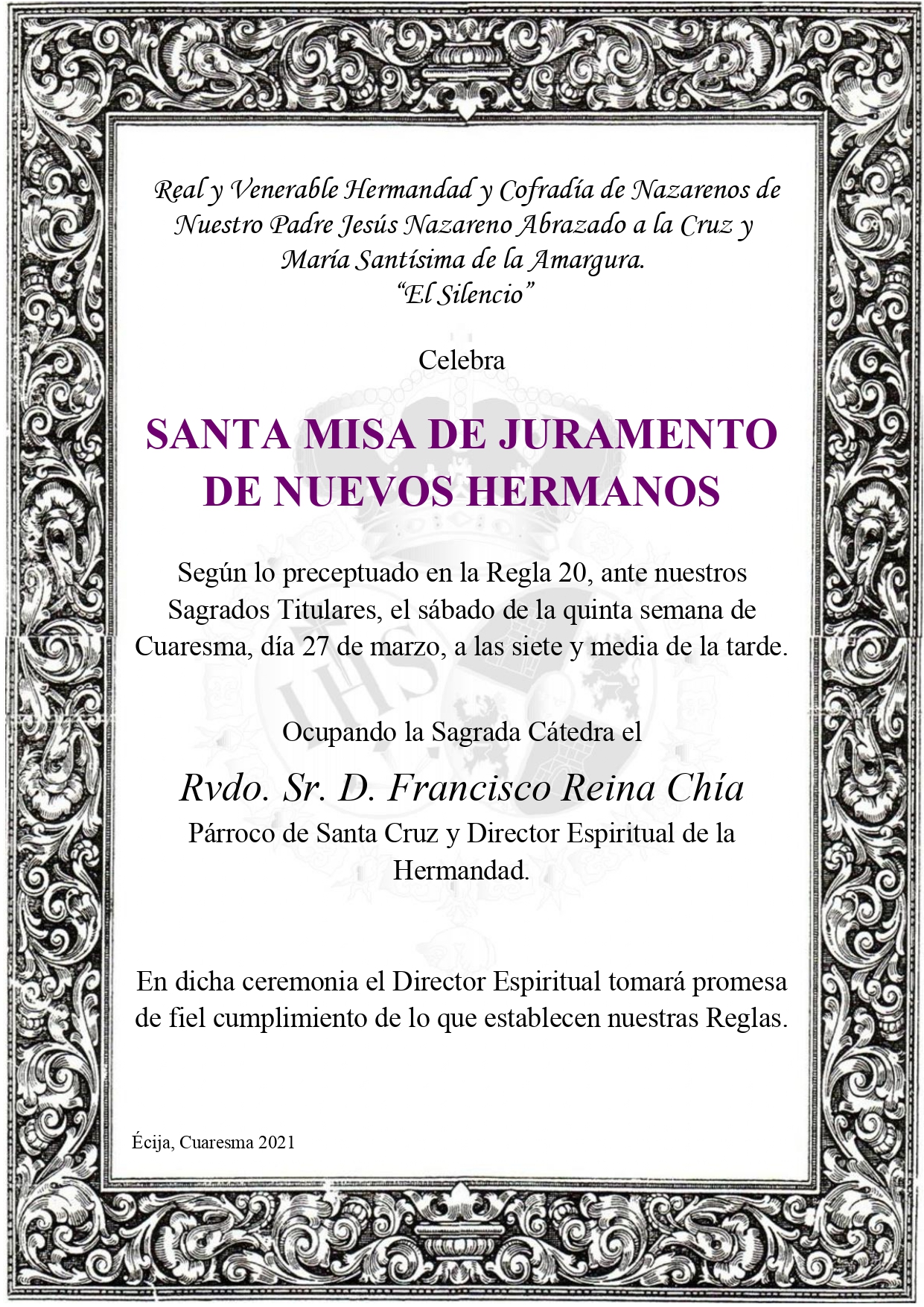 El próximo sábado 27 de marzo, Sábado de Pasión, se celebrará a las 19:30 horas (D.m.) Santa Misa de Juramento de nuevos hermanos.