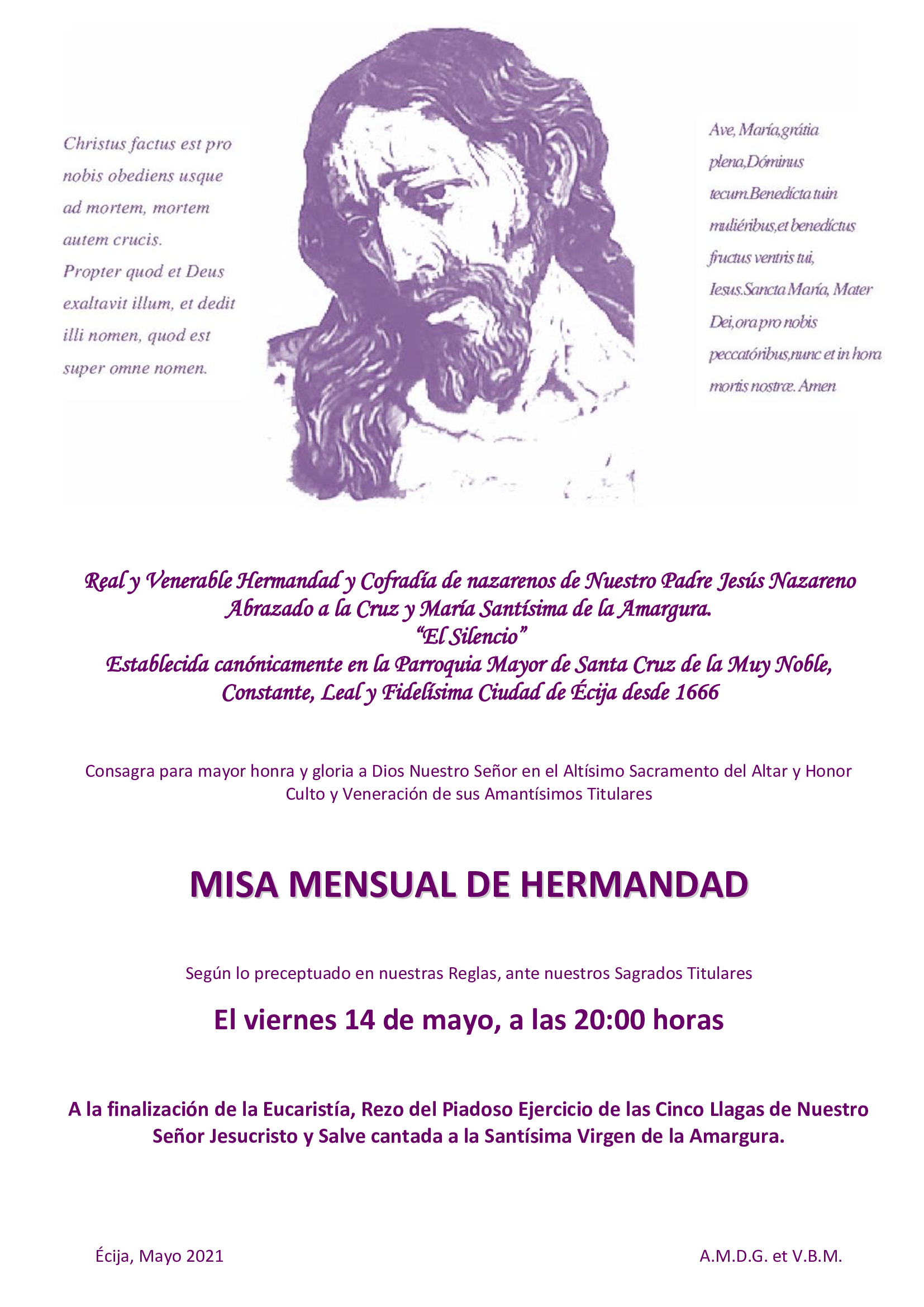 El próximo viernes 14 de mayo, se celebrará (D.m.) Santa Misa mensual de Hermandad, ante el Camarín de nuestros Sagrados Titulares, a las 20:00 horas.