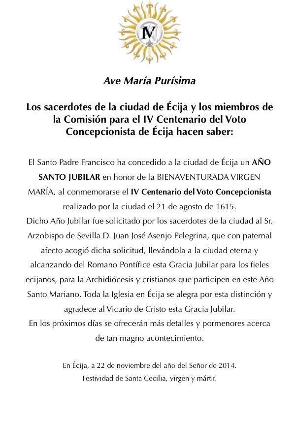 Sin lugar a dudas, hoy sábado 22 de noviembre, será un día para recordar en los anales de la historia. El Santo Padre Francisco I concede Año Santo Jubilar a esta Mariana Ciudad de Écija.