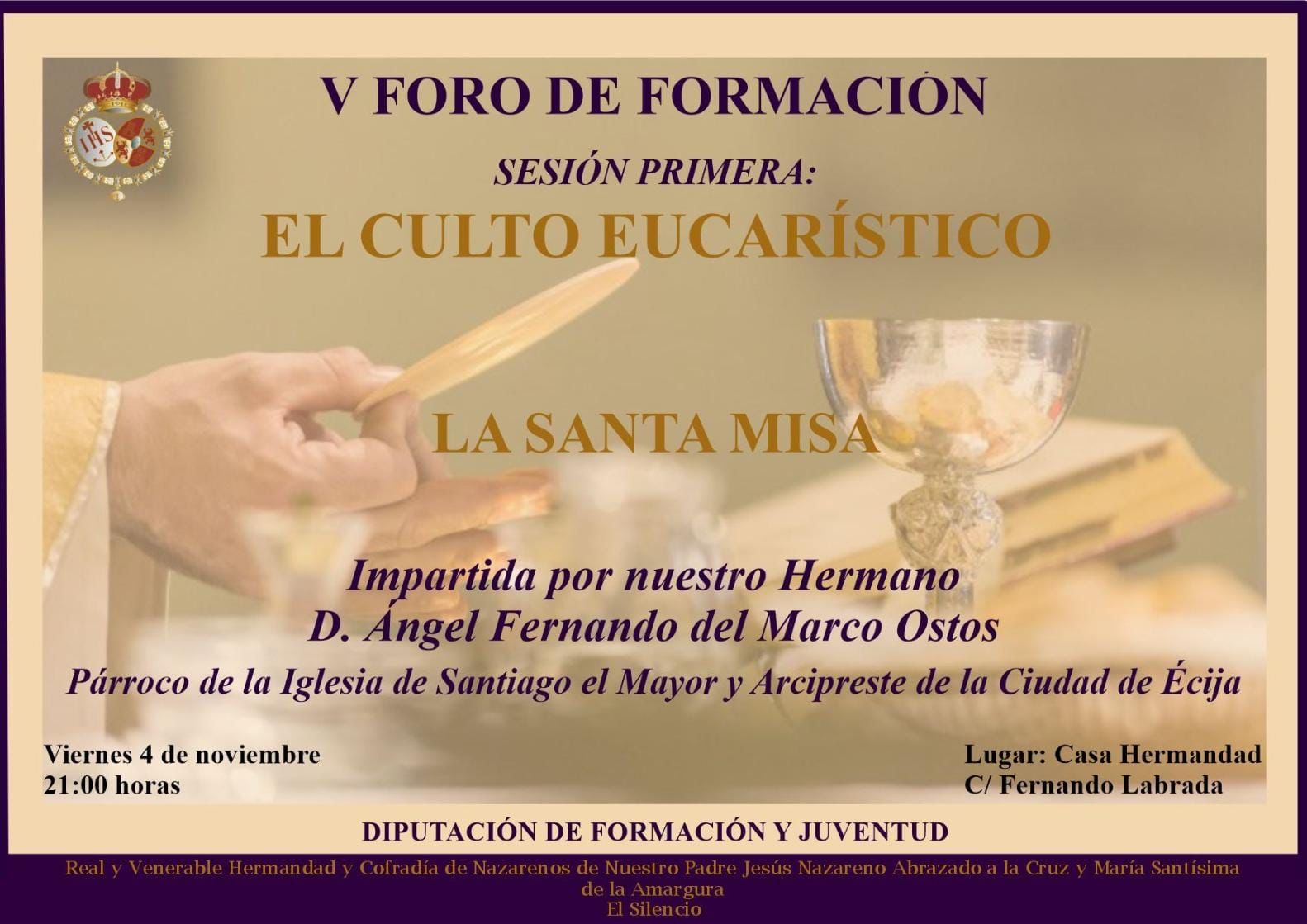 El próximo viernes 4 de noviembre, comenzará en nuestra Hermandad la sesión primera, “El culto Eucarístico”, correspondiente al V Foro de Formación que será impartida por nuestro hermano D. Ángel Fernando del Marco Ostos, Párroco de Santiago el Mayor y Arcipreste de nuestra ciudad.