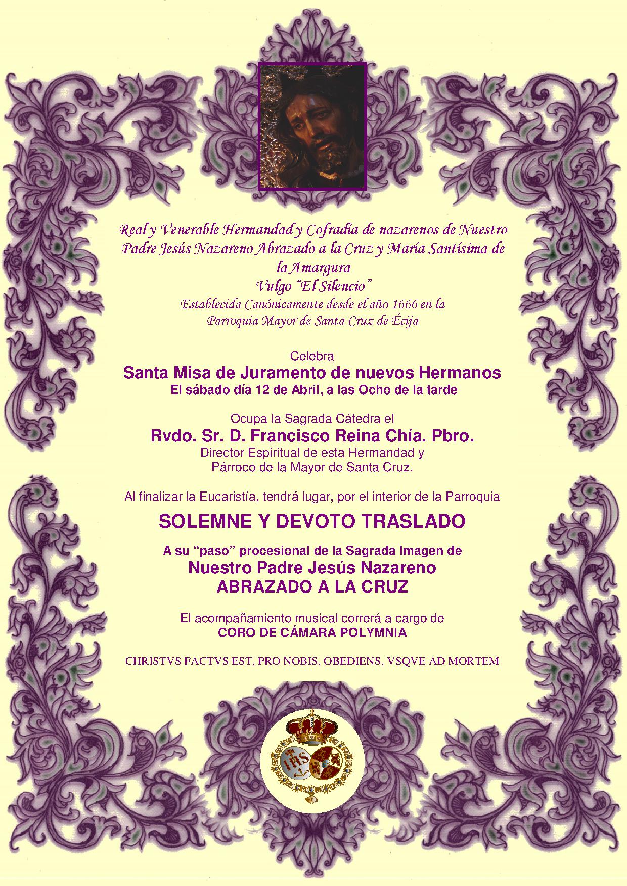 El acto estará precedido por la Santa Misa de Juramento de nuevos Hermanos, donde se le impondrán la medalla corporativa de la Hermandad y jurarán las Reglas, aquellos hermanos y hermanas que hayan cumplido la mayoría de edad necesaria.