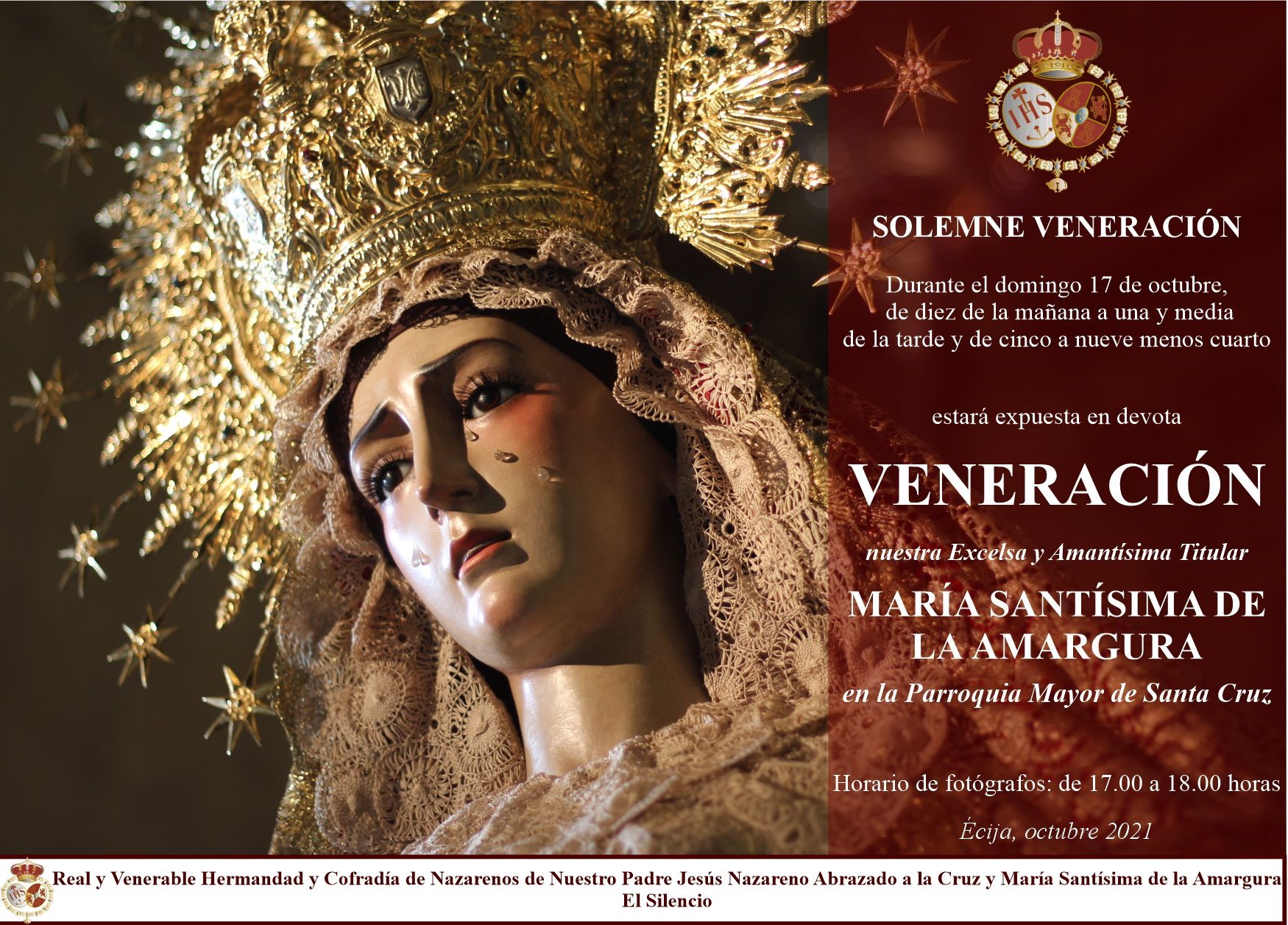 El próximo domingo 17 de octubre (D.m.) en horario de diez de la mañana a una y media de la tarde y de cinco de la tarde a nueve menos cuarto, estará expuesta en devota y solemne veneración de los fieles María Stma. de la Amargura, en nuestra sede canónica la Parroquia Mayor de Santa Cruz.