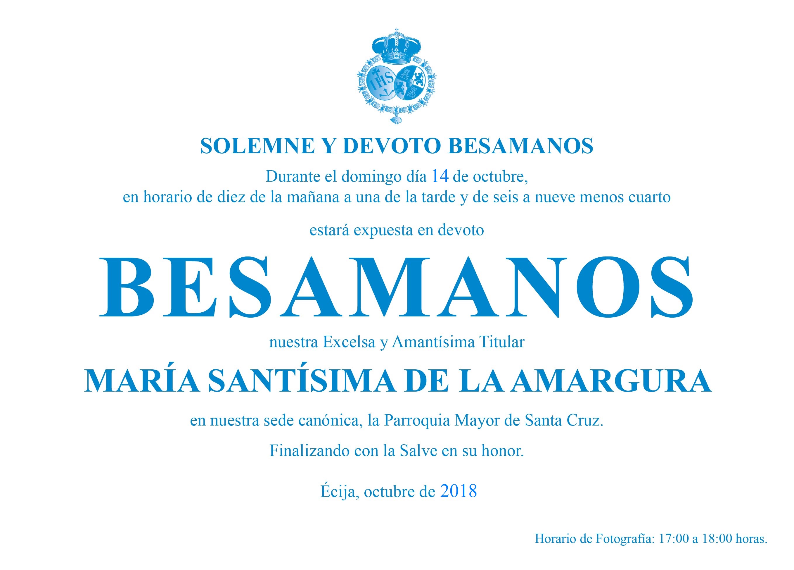 El próximo domingo 14 de octubre de diez a una en horario de mañana y de cinco a nueve menos cuarto en horario de tarde, estando únicamente interrumpido por la Misa dominical de doce del medio día y de ocho de la tarde, estará expuesta para la veneración de todos los hermanos y fieles, en Solemne y Devoto Besamanos, María Santísima de la Amargura, como colofón de los cultos celebrados en honor a Nuestra Madre.