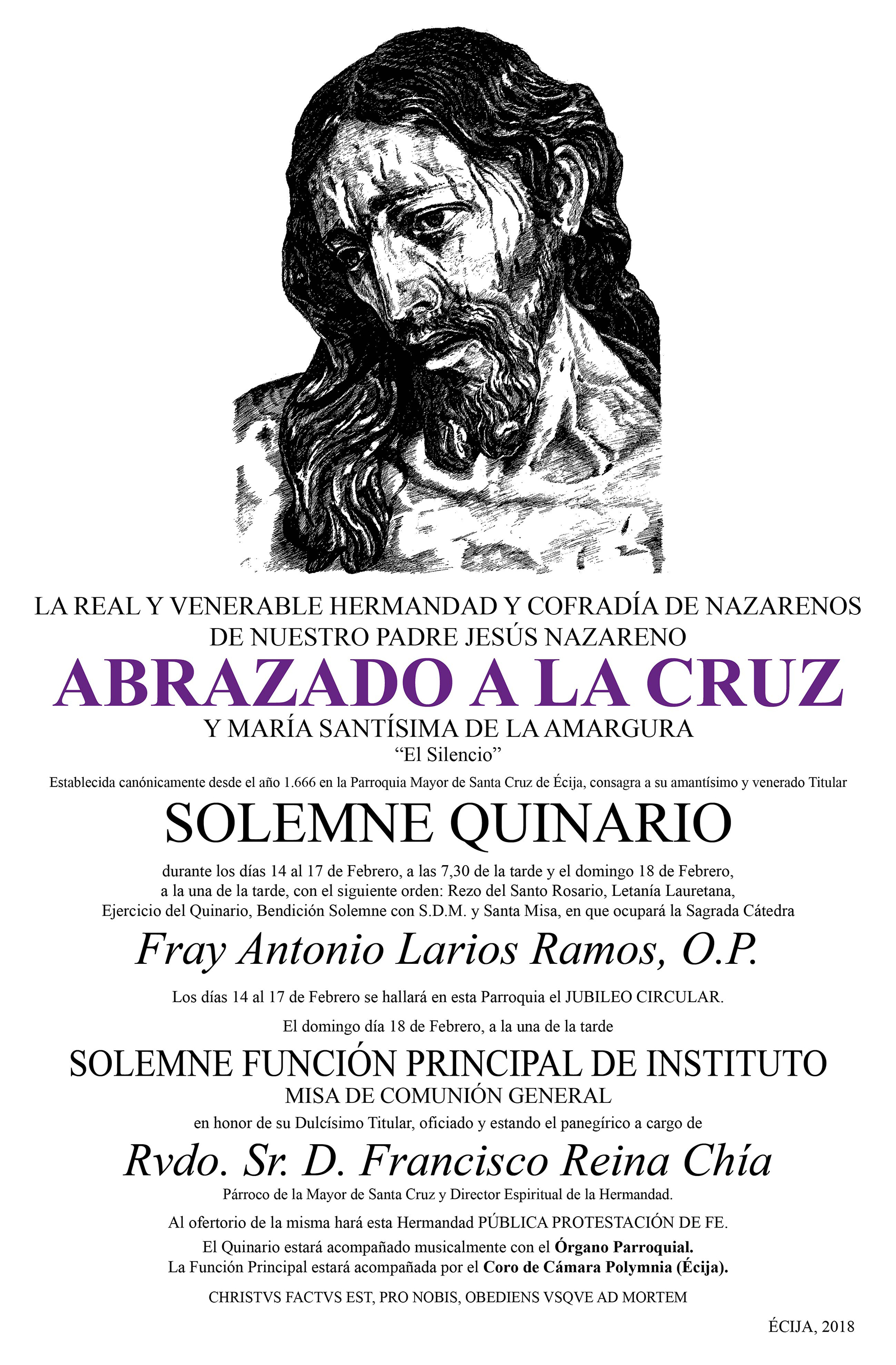 Durante los días 14 al 18 de Febrero se celebrará a las 19:30 horas (D.m.) solemne Quinario en honor a Ntro. Padre Jesús Nazareno Abrazado a la Cruz con el siguiente orden de cultos: Rezo del Santo Rosario, Letanía Lauretana, Ejercicio del Quinario, Bendición Solemne con S.D.M., y Santa Misa. Ocupará la sagrada cátedra Fray Antonio Larios Ramos, O.P.