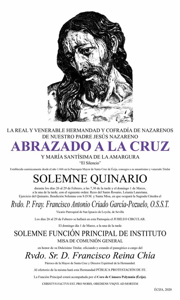 Durante los días 26 a 29 de Febrero, a las 7, 30 de la tarde y el domingo 1 de Marzo, a la 1 de la tarde, se celebrará el Solemne Quinario en honor a Ntro. Padre Jesús Nazareno Abrazado a la Cruz, con el siguiente orden: Rezo del Santo Rosario, Letanía Lauretana, Ejercicio del Quinario, Bendición Solemne con S.D.M. y Santa Misa. Ocupará la Sagrada Cátedra el Rvdo. P. Fray. Francisco Antonio Criado García-Pozuelo, O.S.S.T., Vicario Parroquial de San Ignacio de Loyola, de Sevilla.