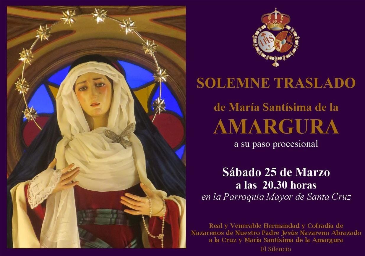 Este sábado, 25 de marzo, a las 20:30 horas, se procederá al traslado de María Stma. de la Amargura a su paso procesional.