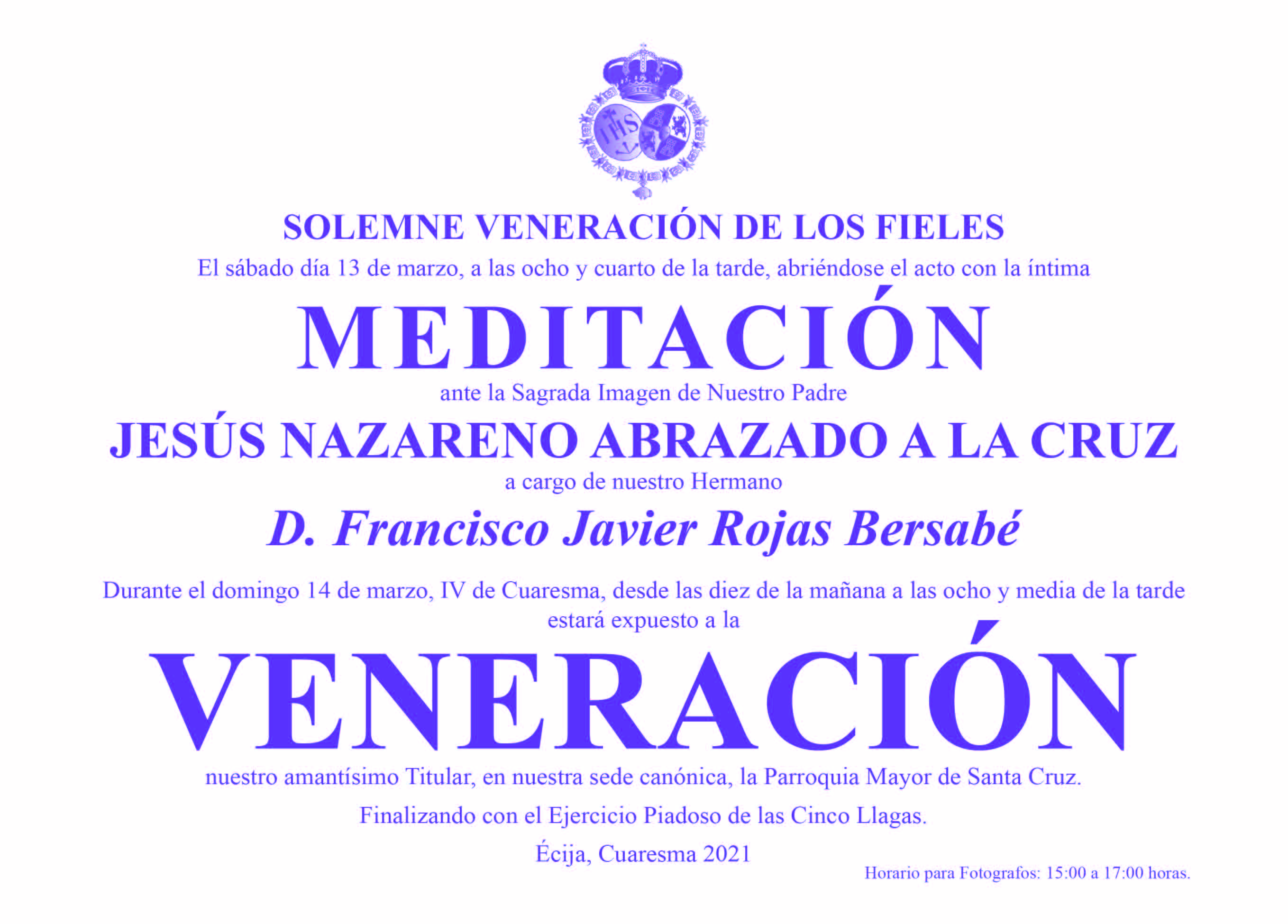 El próximo sábado 13 de marzo, de la III semana de Cuaresma, a las 20:15 horas, (D.m.), tendrá lugar en nuestra sede canónica la Parroquia Mayor de Santa Cruz, según prescribe nuestra Regla 42, intima meditación ante la Sagrada Imagen de Ntro. Padre Jesús Nazareno Abrazado a la Cruz a cargo de N.H.D. Francisco Javier Rojas Bersabé.