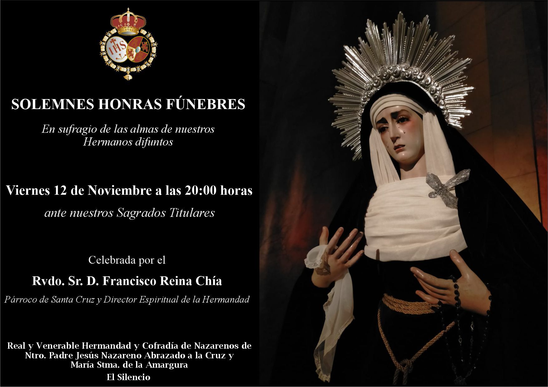 En cumplimiento de la Regla 47, esta Hermandad celebrará este viernes, 12 de noviembre a las 20:00 horas (D.m.), Solemne Misa Réquiem en sufragio del alma de todos los hermanos, devotos y bienhechores difuntos, y en especial por aquellos fallecidos en el presente año.