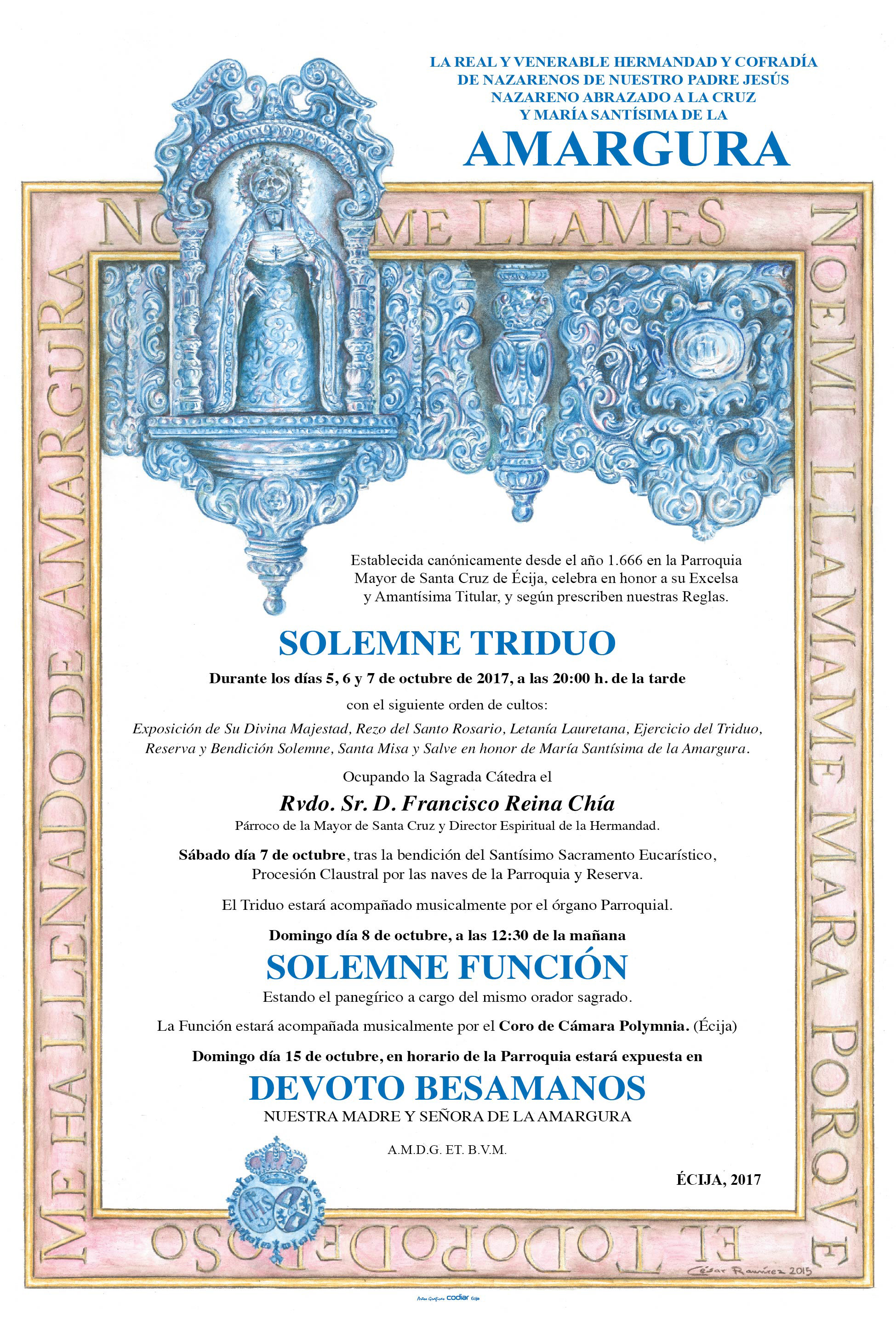 Durante los próximos días 5, 6, y 7 de Octubre, a las 20,00 de la tarde, tendrá lugar (D.m.) Triduo en honor a María Stma. de la Amargura, con el siguiente orden de cultos: Exposición de S.D.M., Rezo del Santo Rosario, Letanía Lauretana, Ejercicio del Triduo, Reserva y Bendición Solemne, Santa Misa, y Salve en honor a María Stma. de la Amargura.