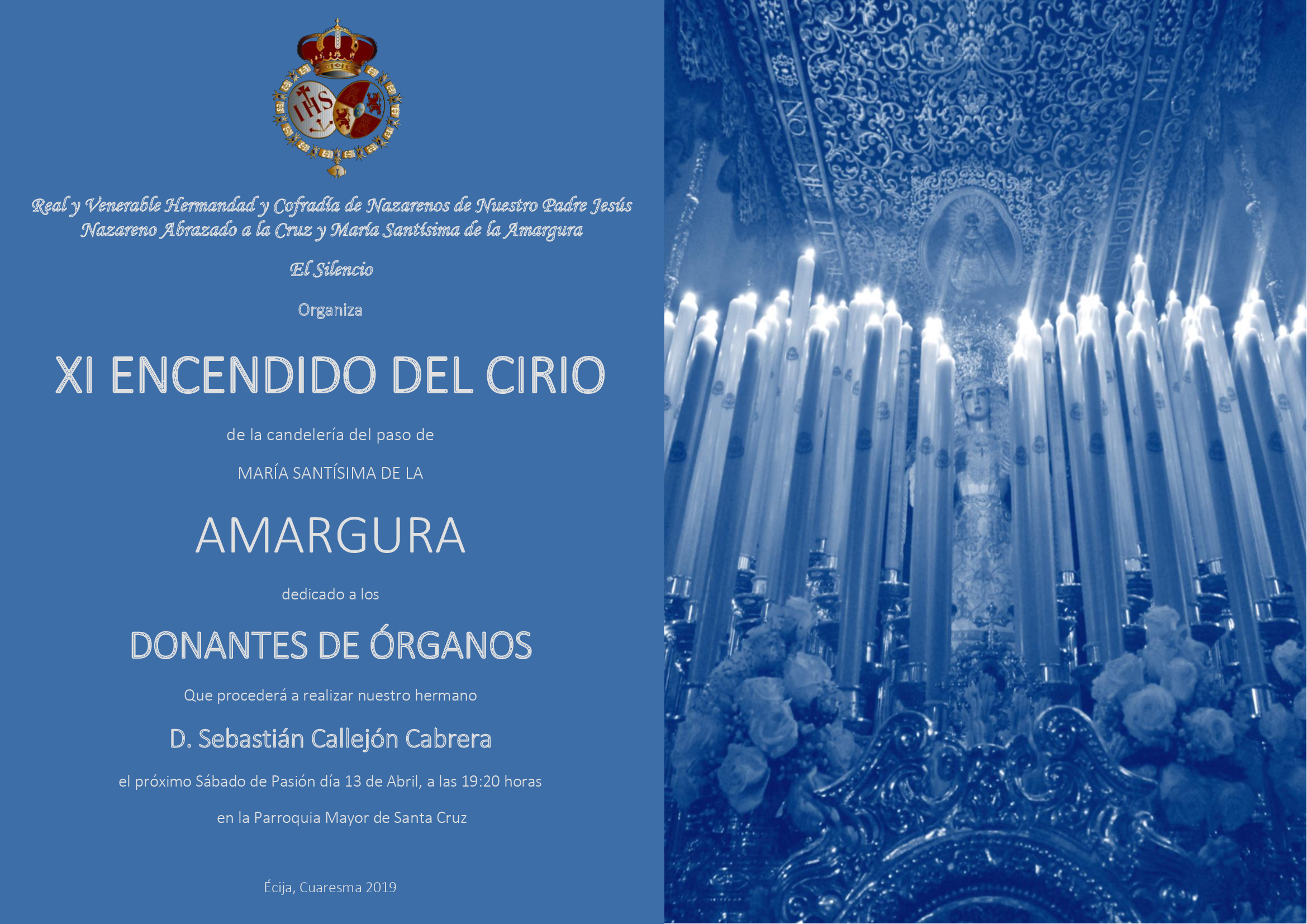 El próximo sábado 13 de abril, Sábado de Pasión, previo a la celebración de la Santa Misa de Juramento de nuevos hermanos, se celebrará como cada año el acto protocolario del encendido del cirio votivo de la candelería del paso de María Stma. de la Amargura, dedicado a los donantes de órganos, que en este año alcanza su undécima edición.