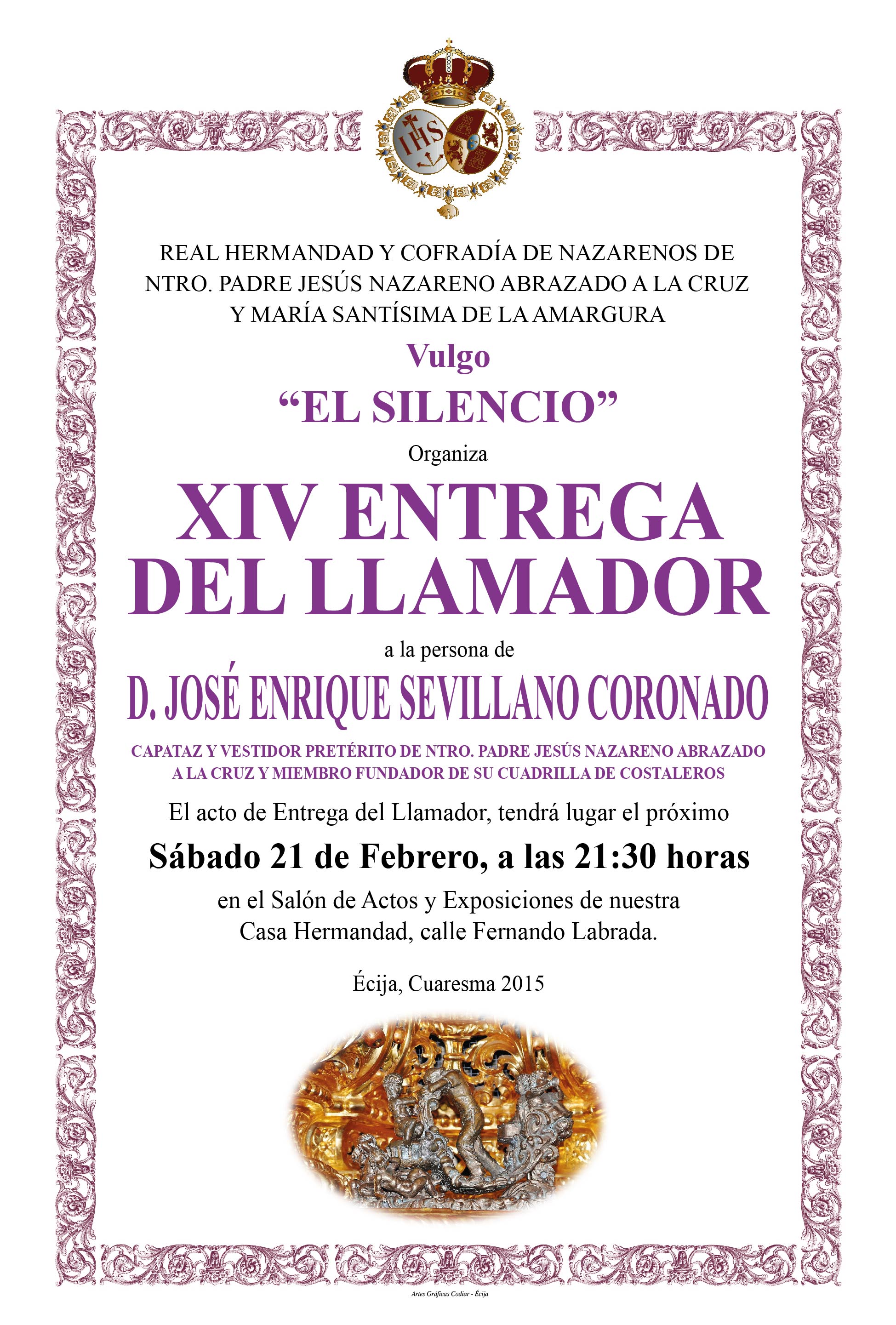 El próximo sábado día 21, tras la finalización del Quinario, tendrá lugar la XIV edición de la Entrega del Llamador.
