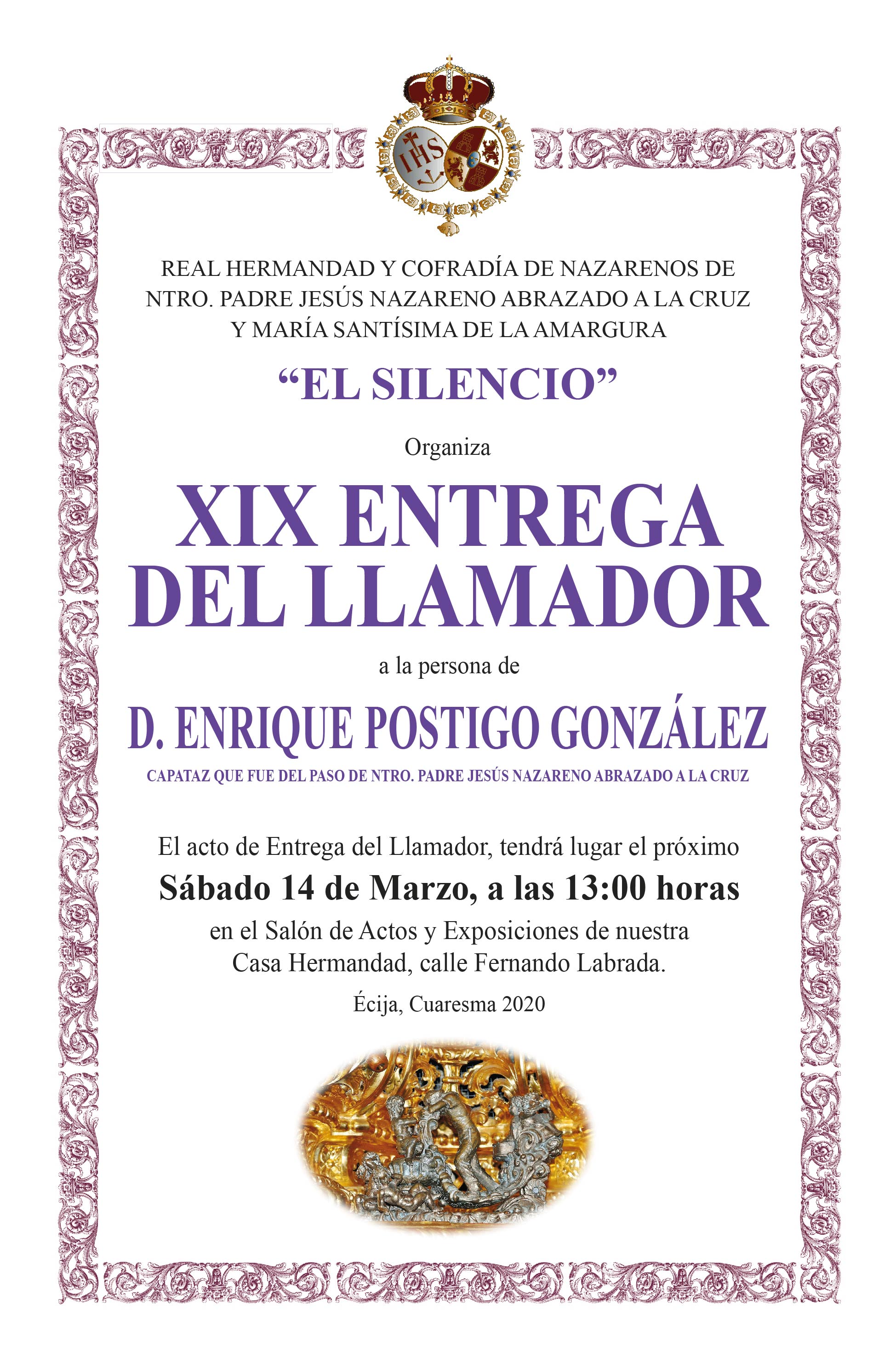 El próximo sábado 14 de marzo a las 13:00 horas en el Salón de Actos y Exposiciones de nuestra Casa Hermandad tendrá lugar la XIX Entrega del Llamador, que recaerá en esta edición en N.H.D. Enrique Postigo González, capataz que fue del paso de Ntro. Padre Jesús Nazareno Abrazado a la Cruz.