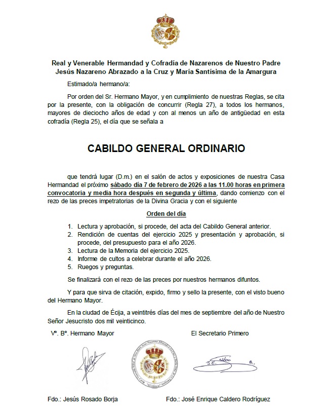 Se adjunta citación para CABILDO GENERAL ORDINARIO de hermanos que tendrá lugar, D.m., en nuestra Casa Hermandad el próximo sábado 7 de febrero a las 11.00 horas en primera convocatoria y media hora después en segunda y última.