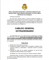 Se adjunta citación para CABILDO GENERAL EXTRAORDINARIO de hermanos que tendrá lugar, D.m., en nuestra Casa Hermandad el próximo viernes 12 de septiembre a las 20.30 horas en primera convocatoria y media hora después en segunda y última.